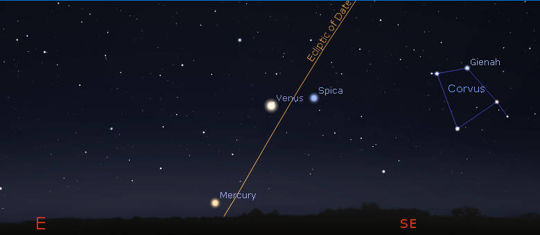 Venus and Mercury with the star Spica, the ecliptic (path of the Sun) and the constellation Corvus at 6:30 tomorrow morning November 19, 2020. Created using Stellarium.