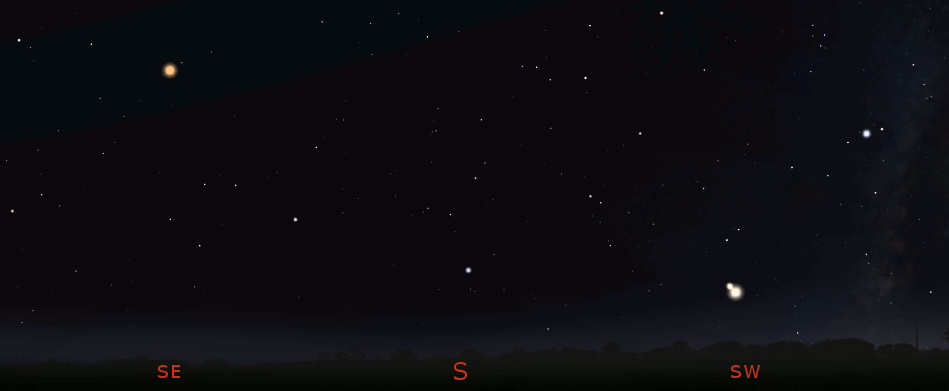 The evening planets seen at 6:30 pm or about an hour and a half after sunset December 9, 2020. Animation showing non-annotated sky and then with annotations. Click on the image to enlarge. Created using Stellarium and GIMP.