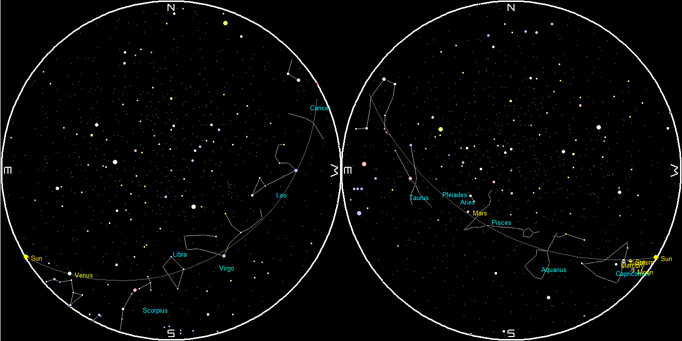Planets and the Moon at sunset and sunrise of a single night starting with sunset on the right on January 13, 2021. The night ends on the left with sunrise on the 14th. I’m afraid that the labels for Jupiter and Saturn will overlap, since the planets are very close. Click on the image to enlarge. Created using my LookingUp program.