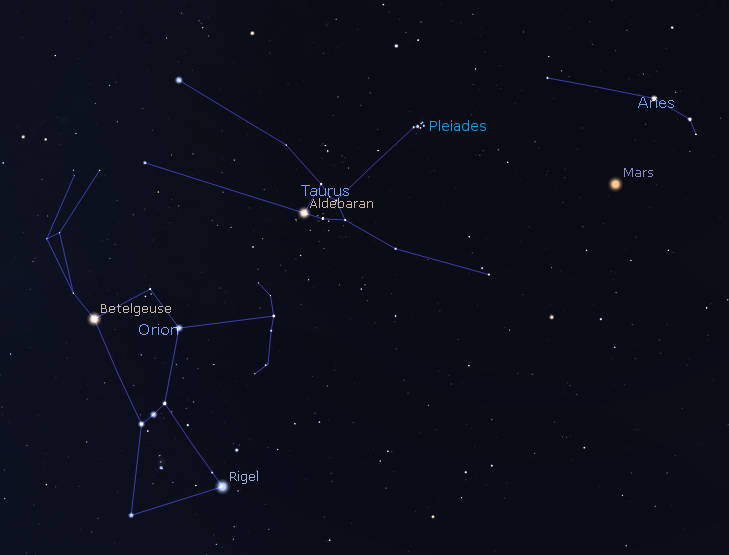 Let’s have a lookout for the naked-eye planets for this week. Mercury will be low in the west-southwestern sky around 6:15 pm or about a half hour after sunset. It will set at 7:18 pm. Saturn and Jupiter are too close to the direction of the Sun to be seen. Saturn has passed into the morning sky, while Jupiter will pass behind the Sun tomorrow. Neither of these planets are visible. It will be a month or more before even Saturn will be visible in the morning twilight. Mars can be found quite high in the south at 7 pm. It will actually be due south at 6:43 tonight. Mars is increasing its speed eastward through the constellation of Aries the ram and will set at 1:52 am. Venus will be hard to spot in the morning twilight after it rises at 7:26 am tomorrow.