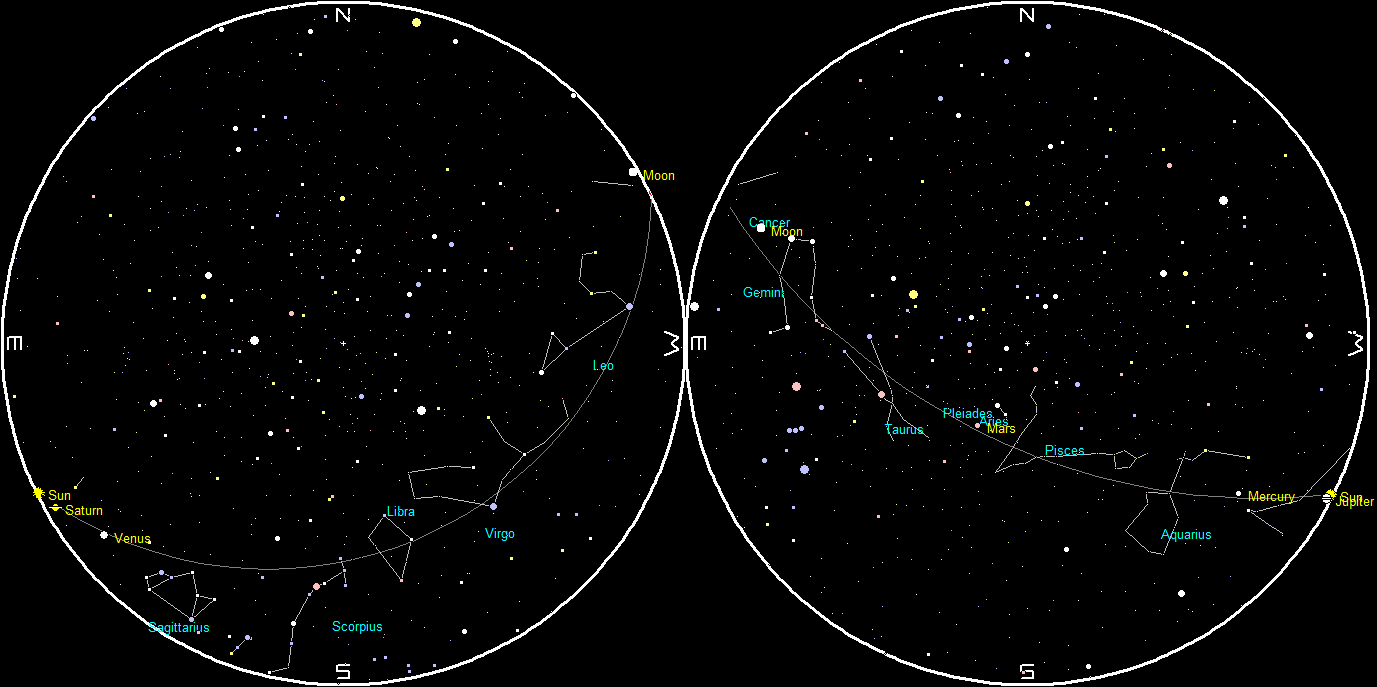 Planets and the Moon at sunset and sunrise of a single night starting with sunset on the right on January 27, 2021. The night ends on the left with sunrise on the 28th. I’m afraid that the labels for Jupiter and the Sun overlap, since the planets and Sun are very close. Click on the image to enlarge. Created using my LookingUp program.