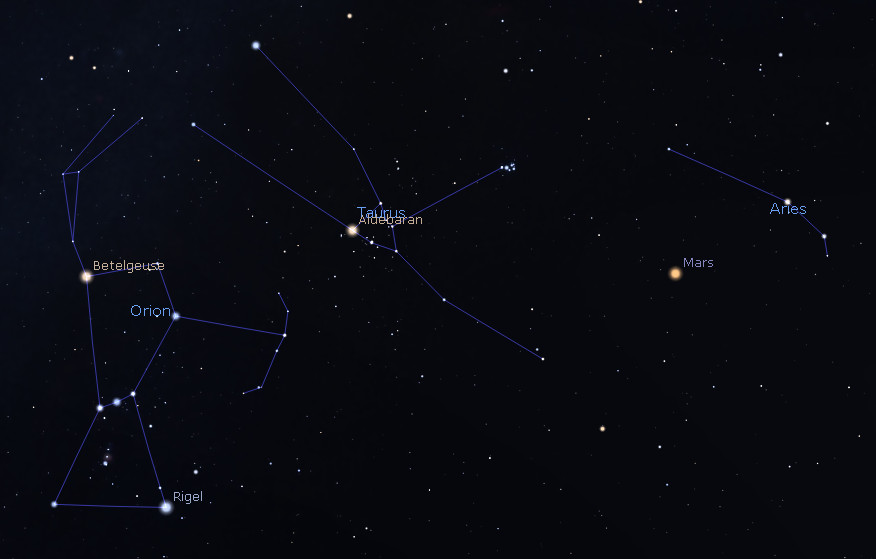 Mars finder chart. Showing Mars in Aries. Also shown are Taurus and Orion. All are seen tonight at 8 pm, February 3, 2021. Click on the image to enlarge. Created using Stellarium.