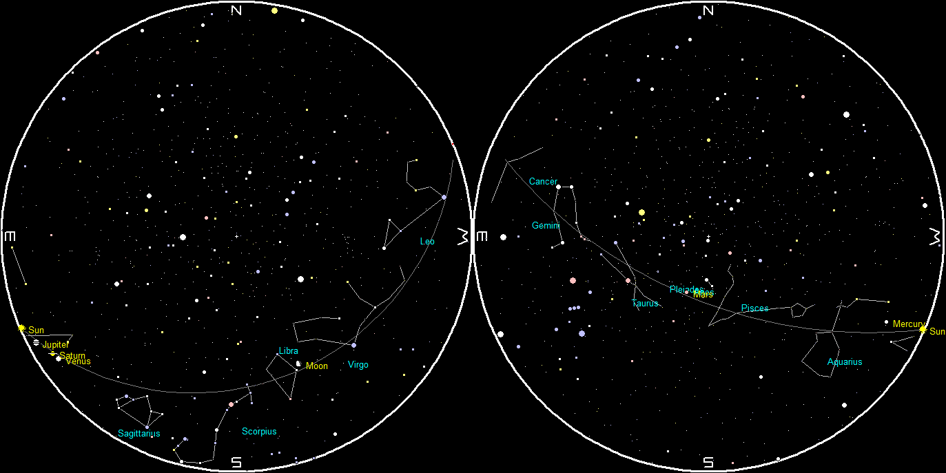 Planets and the Moon at sunset and sunrise of a single night starting with sunset on the right on February 3, 2021. The night ends on the left with sunrise on the 4th. I’m afraid that the labels for Jupiter and the Sun overlap, since the planets and Sun are very close. Click on the image to enlarge. Created using my LookingUp program.