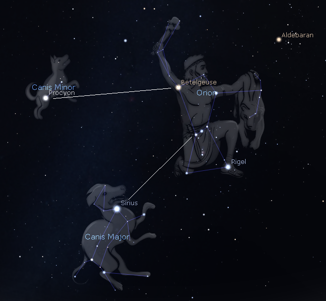 Orion and his hunting dogs with pointers as seen February. I didn’t have time in the program to mention Canis Minor, the little dog. I expect to cover it in the future, or you can search for Canis Minor in the search box above. Created using Stellarium.
