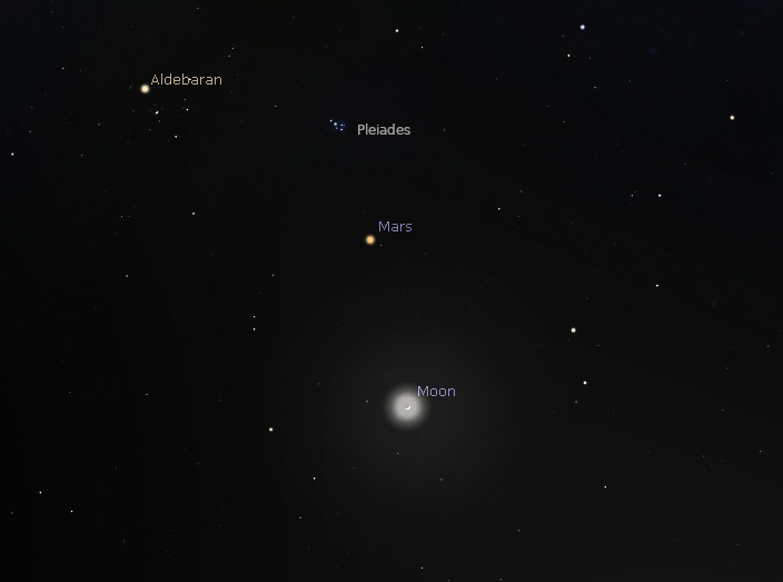 Mars and the Moon in the southwestern sky at 8 pm tonight, February 17, 2021. Created using Stellarium.