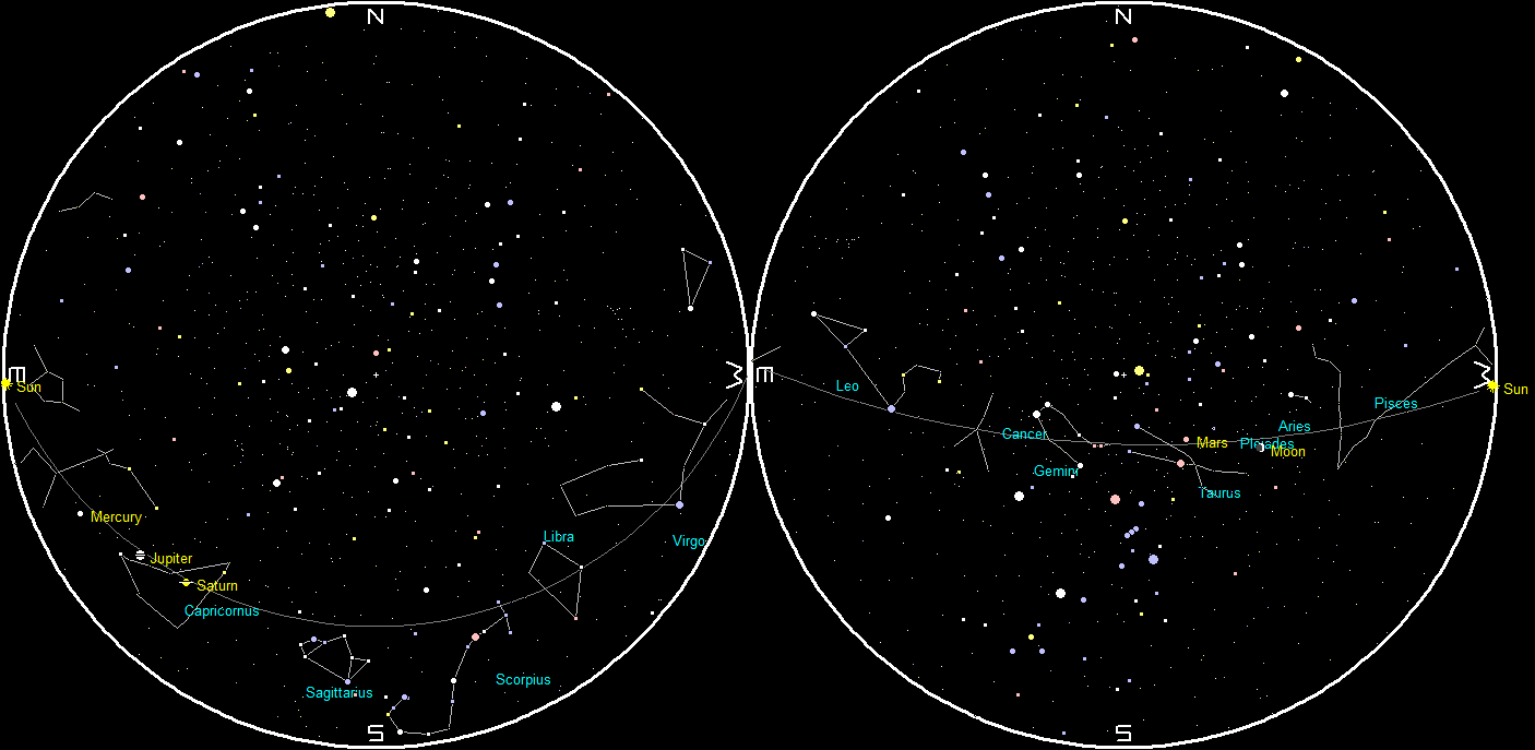 Let’s search for the naked-eye planets for this week. Unfortunately the only one you’ll find in the evening is Mars. It can be found high in the west-southwest at 9 pm tonight, above a line between the Pleiades star cluster on its lower right and the letter V of stars that is the face of Taurus the bull on its lower left. The Pleiades will be above tonight’s waxing crescent Moon. Mars will set at 2:07 am.