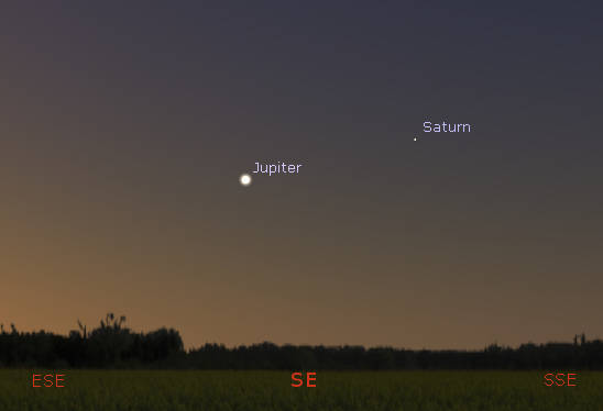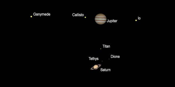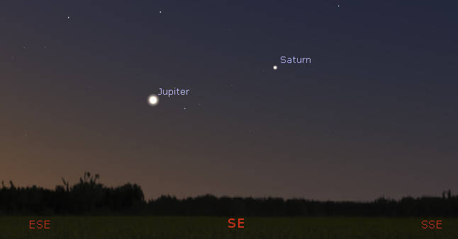 Let’s search for the naked-eye planets for this week. Unfortunately the only one you’ll find in the evening is Mars. It can be found in the west at 10 pm tonight, in the constellation of Gemini the twins. Tonight it’s just above Castor’s foot. Mars will set at 1:21 am. Both Venus and Mercury are now just east of the Sun and to close to it to be spotted. Venus will be setting 43 minutes after sunset, with Mercury setting 27 minutes later. We should start spotting Mercury next week. It will be late May or early June before Venus will be easily seen. Jupiter and Saturn, are west of the Sun in the morning twilight. Saturn will rise at 3:24 am, with Jupiter rising at 4:03 am. By 6 am they will be low in the southeast. Jupiter, on the left, is the brighter of the two.