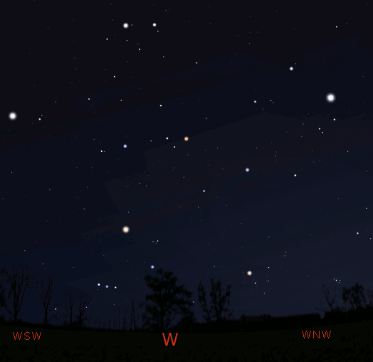 Let’s search for the naked-eye planets for this week. Unfortunately the only one you’ll find in the evening is Mars. It can be found in the west at 10 pm tonight, between the constellations of Taurus the bull below and Gemini the twins above. Tonight it’s just off Castor’s big toe. Mars will set at 1:30 am. Venus is now just east of the Sun, setting 31 minutes after sunset. It will be late May or early June before it will be easily spotted in the evening twilight. Mercury is between the Sun and Venus. Saturn and Jupiter are at a far enough angle from the Sun to be spotted in the morning twilight. Saturn will rise at 3:51 am, with Jupiter rising at 4:28 am. By 6 am they will be low in the southeast.