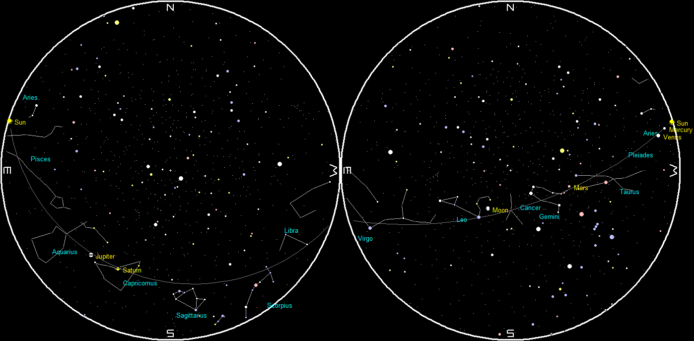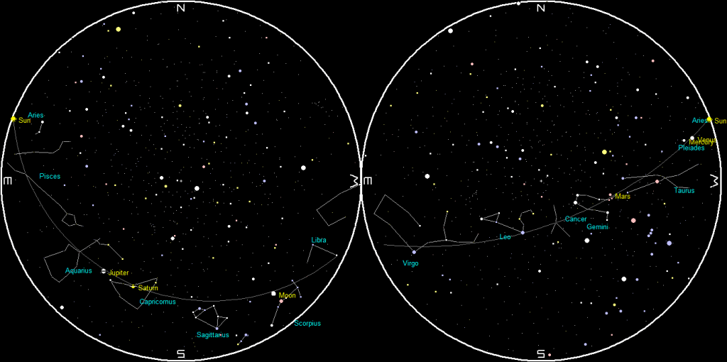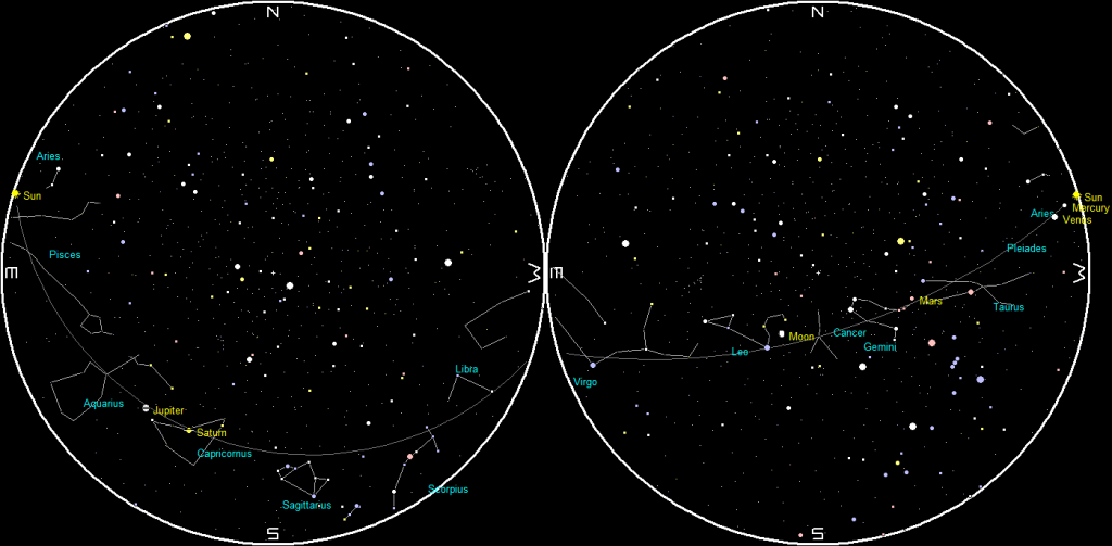 Note the chart times of 11 p.m. and 5 a.m. are for the 15th. For each week before the 15th add ½ hour (28 minutes if you’re picky). For each week after the 15th subtract ½ hour, or 28 minutes. The planet positions are updated each Wednesday on this blog. For planet positions on dates other than the 15th, check the Wednesday planet posts on this blog for weekly positions.