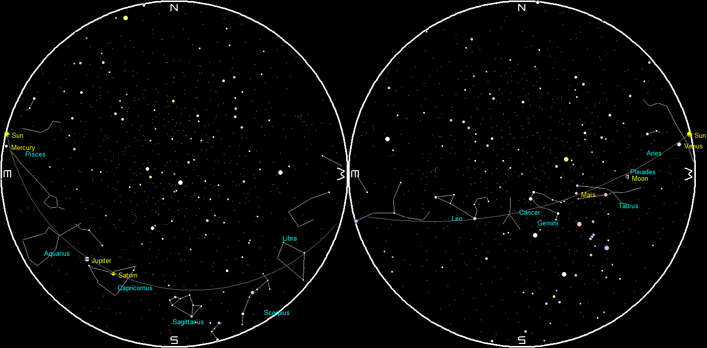 Let’s search for the naked-eye planets for this week. Unfortunately the only one you’ll find in the evening is Mars. It can be found in the west at 10 pm tonight, between the constellations of Taurus the bull below and Gemini the twins above. Mars will set at 1:39 am. Venus is now just east of the Sun, setting 23 minutes after sunset. It will be late May or early June before it will be easily spotted in the evening twilight. The other three naked-eye planets are west of the Sun in the morning sky. Only Saturn and Jupiter are at a far enough angle from the Sun to be spotted in the morning twilight. Saturn will rise at 4:17 am, with Jupiter rising at 4:53 am. By 6 am they will be low in the southeast.