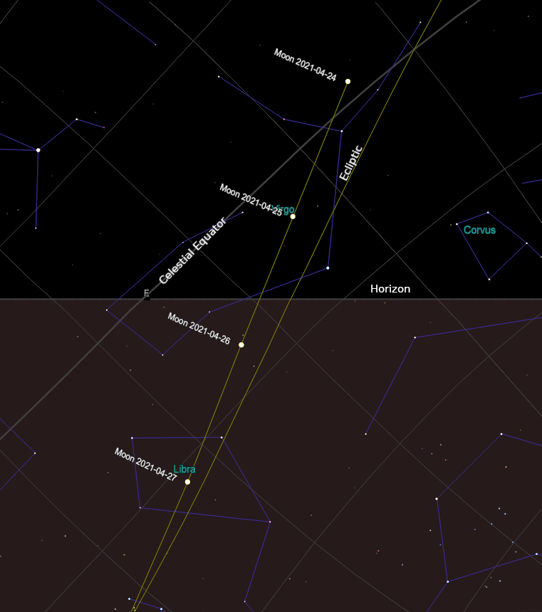 Let’s think back to last fall and the Harvest Moon. The big deal about the Harvest Moon is the Moon lingers, rising or being bright in twilight to help illuminate the harvesters of old by effective lengthening the effects of daylight. The spring bright Moon after full moon rises much later night to night. Six months ago the difference in the rise times of the Moon between the full moon and the next day was 20 minutes. Today the Moon will rise 96 minutes later than it did yesterday. The reason is the beside moving eastward, it is also moving southward to where the Sun was in late fall. So it rises much later each night than it did after full moon last fall. As it is the dark skies are moving to later and later in the evening due to the spring season and daylight time.