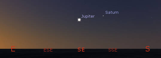 Jupiter and Saturn in morning twilight tomorrow morning May 23, 2021. Created using Stellarium.
