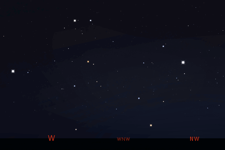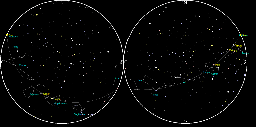 Let’s search for the naked-eye planets for this week. Mars will be joined by two more planets seen in twilight. Both Mercury and Venus are now just above where the Sun set. By 9:30 pm Mercury should be able to be spotted low in the west-northwest. Venus might be spotted lower and somewhat earlier. Venus will be setting at 10:02 pm with Mercury following at 11 pm. Mars can be found in the west at 10 pm tonight, in the constellation of Gemini the twins. Tonight it’s in the middle of the constellation. Mars will set at 1:02 am. Jupiter and Saturn, are in the morning sky. Saturn will rise at 2:30 am, with brighter Jupiter rising at 3:13 am. By 5:30 am they will be low in the southeast in the morning twilight.