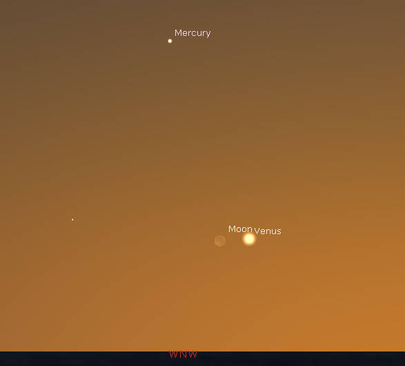 Mercury and Venus low in the west-northwest tonight at 9:30 pm or a half hour after sunset. The one-day-old Moon appears just to the left of Venus. Mercury will be 14 degrees above the Lake Michigan horizon, and Venus only 5 degrees. By tomorrow night, the Moon will be to the left of Mercury. Created using Stellarium.