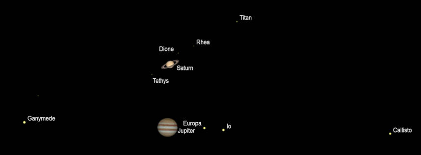Saturn and Jupiter as seen in a small telescope at the same magnification. Apparent diameters: Saturn, 17.05″, rings, 39.71″; Jupiter, 38.83″. Mars is too far away to make out detail on its surface, except maybe a polar cap. Its apparent diameter is 4.43″. Venus’ apparent diameter is 9.97″ and will be added when it gets far enough from the Sun to be easily seen. Mercury’s apparent diameter is 7.29″. The cutoff for whether to show a planet here is an apparent diameter of 10″ or greater. The ” symbol means seconds of arc (1/3600th of a degree). Created using Cartes du Ciel (Sky Charts).