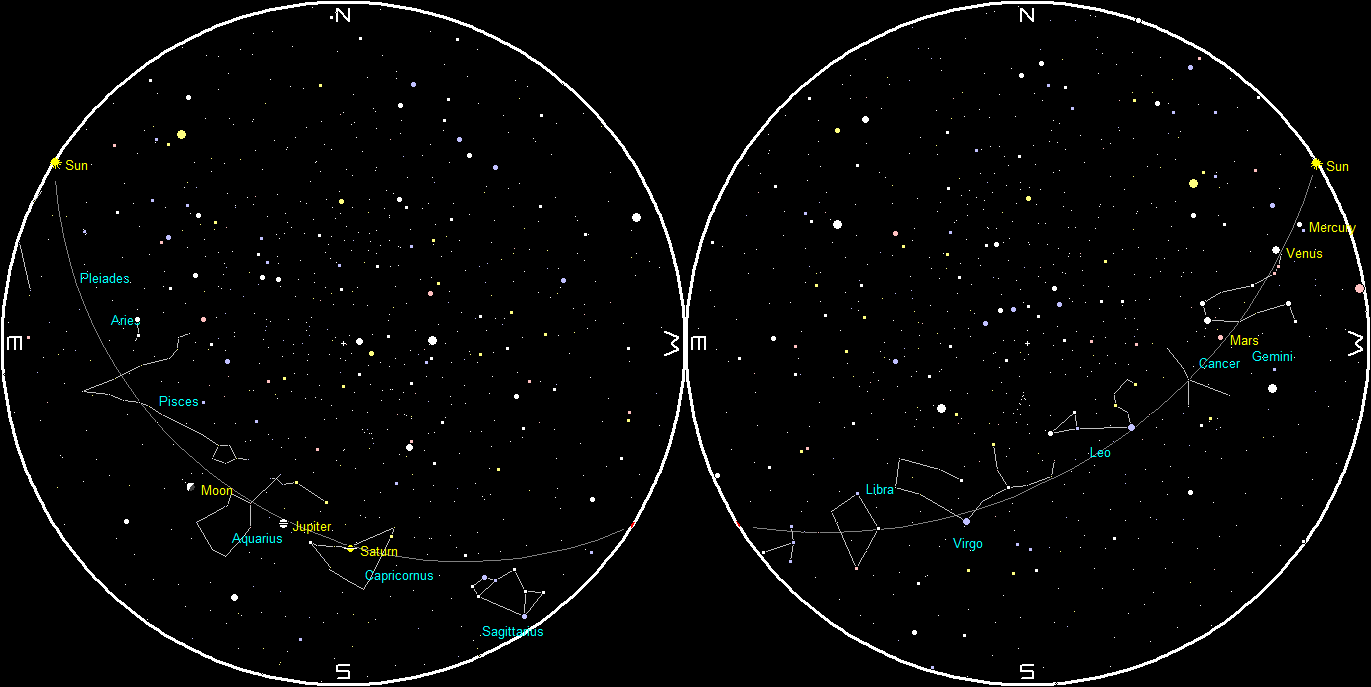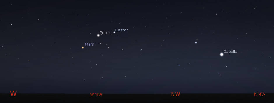 Let’s look for the naked-eye planets for this week. Venus can be spotted low in the west-northwest twilight by 10 pm. Venus will set at 10:49 pm. Mars can be found in the west at 10:30 tonight, and about to leave the constellation of Gemini, the twins. Tonight it’s below and left of Gemini’s brightest star, Pollux. Mars will set at 12:34 am. Jupiter and Saturn, are in the morning sky. Saturn will rise at 1:08 am. It’s seen with the stars of Capricornus. It has begun its retrograde or westward motion caused by the fact that we are viewing it from another moving planet. Brighter Jupiter, is now within the boundaries of Aquarius, and will rise at 1:55 am. By 5 am these two planets will be in the south-southeast in the morning twilight.