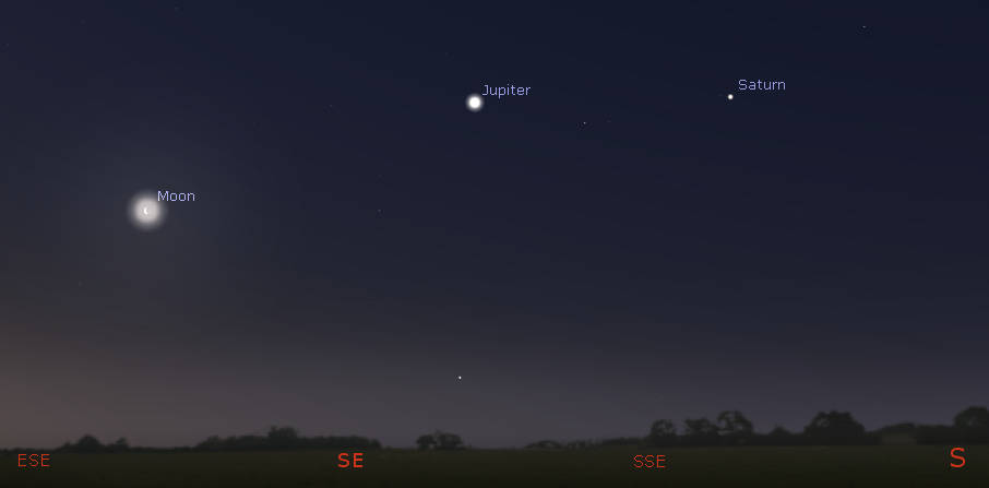 Saturn Jupiter and the crescent Moon at 5 am, about an hour before sunrise. Click on the image to enlarge. Created using Stellarium.