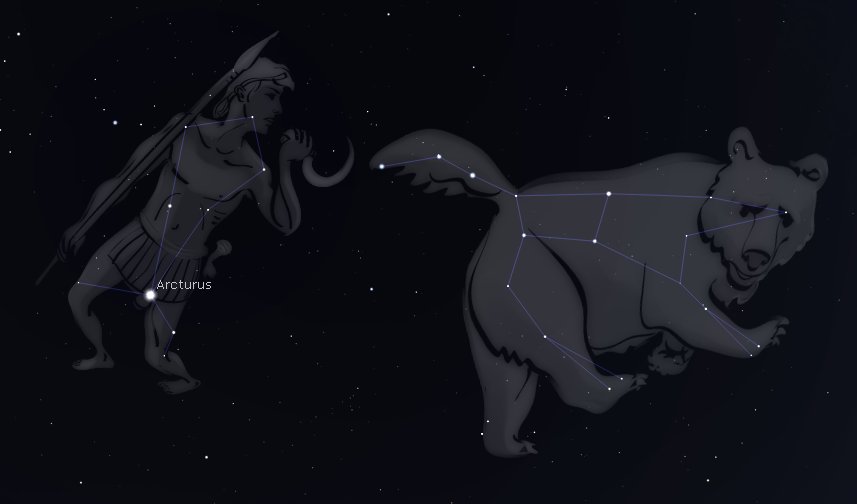 Arcturus is a bright orangish star that’s high in the south at 11 pm. It’s also found by following the arc of the handle of the Big Dipper, which is the ridiculous tail of Ursa Major the Great Bear. It was considered the “Guardian of the Bear”, It is in the base of the kite shaped constellation of Boötes, the herdsman or the Bear Chaser. The latter story I recounted earlier this year. The name from the Greek has been confused with the bear itself. Thus, in the King James version of the Bible Arcturus, not the Bear, meaning the Great Bear, is mentioned in the 38th chapter of Job. This has been corrected in the newer versions I’ve seen. Arcturus has a rich history in literature, mostly by being confused with the Great Bear.