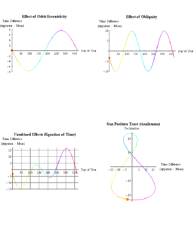 These graphs show how the earth’s orbit eccentricity and tilt of the Earth’s axis (obliquity) affect sundial time keeping vs. actual clocks. This also affects sunrise and sunset times. The figure 8 in the lower right is the analemma, sometimes seen on old Earth globes, a graphical representation of the equation of time (sundial corrections from apparent to mean solar time).