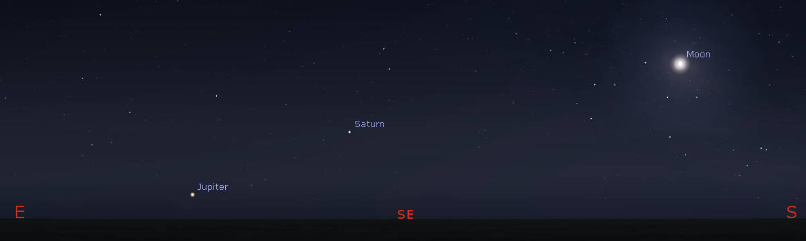 The Gibbous Moon, Saturn, and Jupiter at 11 pm, tonight, July 21, 2021. The Moon is above the spout in the asterism of the Teapot in Sagittarius. Click on the image to enlarge it. Created using Stellarium.