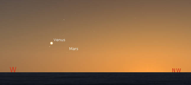 Venus and Mars in evening twilight at 10 pm, about 40 minutes after sunset, tonight, Julyn21, 2021. Regulus, the first magnitude star in Leo, will appear just below and left of Venus. Click on the image to enlarge it. Created using Stellarium.