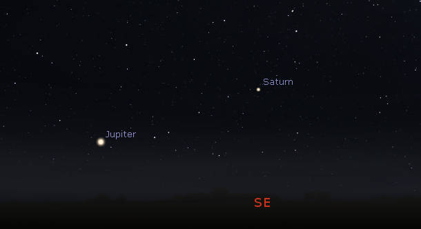 Telescopic view of the bright planets (north up) as they would be seen in a small telescope, with the same magnification, this evening, July 28, 2021. Apparent diameters: Venus, 12.58″; Saturn 18.59″, its rings 43.31″; Jupiter, 48.28″. The ” symbol means seconds of arc (1/3600th of a degree.) Click on the image to enlarge it. Created using Cartes du Ciel (Sky Charts).