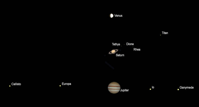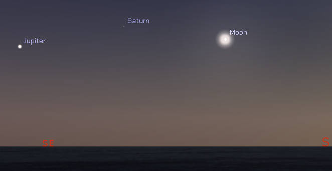 Jupiter Saturn and the Moon at 8:30 tonight, about 40 minutes after sunset, September 15, 2021. Created using Stellarium.