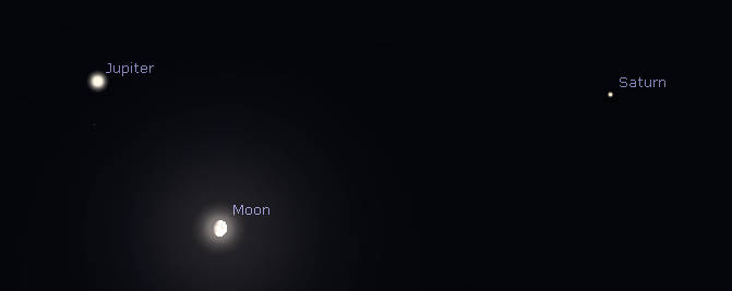 Jupiter, Saturn and the Moon tonight at 9 pm tonight, September 17, 2021. Jupiter will be moving to be directly below Jupiter by one in the morning. Created using Stellarium.