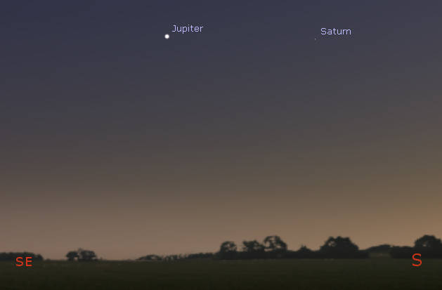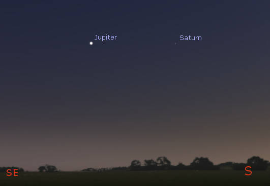 Jupiter and Saturn in evening twilight at 7:15 pm tonight, October 27, 2021. Created using Stellarium.