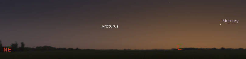 Mercury and the star Arcturus in the morning twilight at 7:15 am, about 50 minutes before sunrise tomorrow morning, October 21, 2021. Don’t confuse the two. Click on the image to enlarge it. Created using Stellarium.