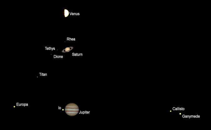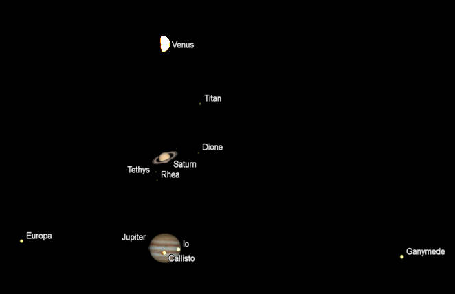 Let’s search for the naked-eye planets for this week. Venus should be visible in the southwestern evening twilight by 7 tonight. It will set at 8:43 pm. By 7:15 pm, Jupiter will be spotted in the south-southeastern sky. Jupiter should be easy to spot at that hour. Saturn will be dimmer, and to its right. They will be visible for a while after midnight in the southwest, with Saturn setting first at 12:37 am, and Jupiter following at 1:57. Saturn’s rings are a beautiful sight in a telescope of even modest power, but the planet will appear tiny. In the morning sky, Mercury will be visible and low in the east-southeast for most of the 7 am hour. All four of Jupiter’s brightest moons will be visible in binoculars early in the evening tonight.