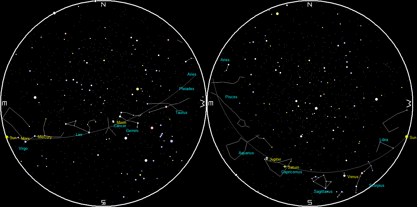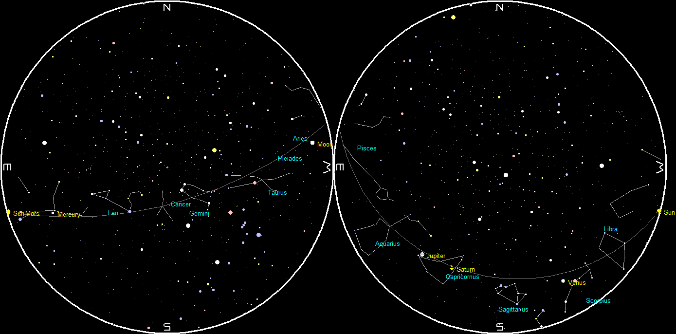 Let’s search for the naked-eye planets for this week. Venus should be visible in the southwestern evening twilight by 7:10 tonight. It will set at 8:44 pm. By 7:30 pm, Jupiter will be spotted in the south-southeastern sky. Jupiter should be easy to spot at that hour. Saturn will be dimmer, and to its right. They will be visible for a while after midnight in the southwest, with Saturn setting first at 1:04 am, and Jupiter following at 2:24. Saturn’s rings are a beautiful sight in a telescope of even modest power, but the planet will appear tiny. In the morning sky, Mercury will be visible and low in the east-southeast by 7:15 am. It will reach its greatest separation from the Sun in six days.