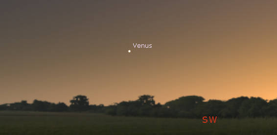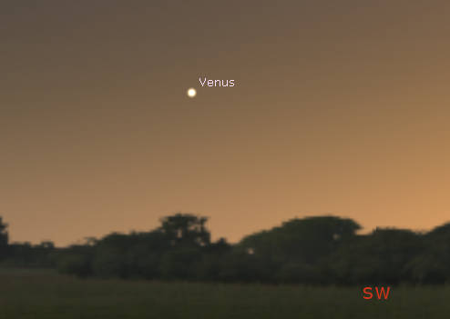 Venus seen in twilight at 7:10 pm, about 20 minutes after sunset tonight, October 20, 2021. Created using Stellarium.