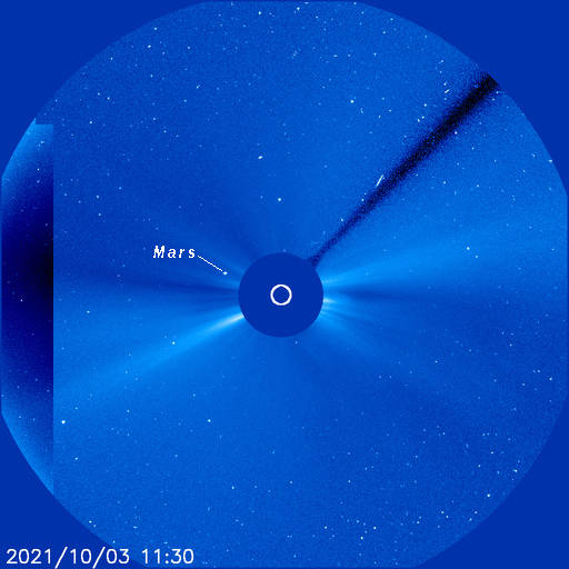 Mars beyond and to the upper left of the Sun yesterday. It’s tough to get intelligible radio signals through the solar corona. Credit: NASA/ESA SOHO* spacecraft. The annotation is mine.