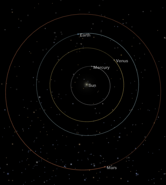 Mars in solar conjunction. Looking at the inner solar system.  Mars, near the bottom of the image, is 244.6 million miles (393.9 million kilometers) from Earth. Click on the image to enlarge it. Credit NASA’s Eyes app.