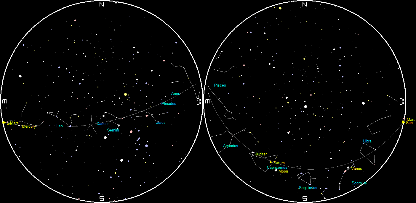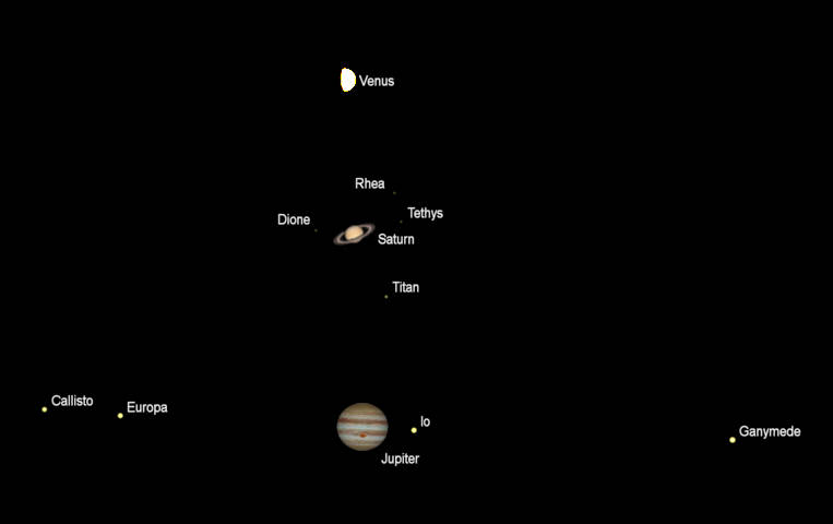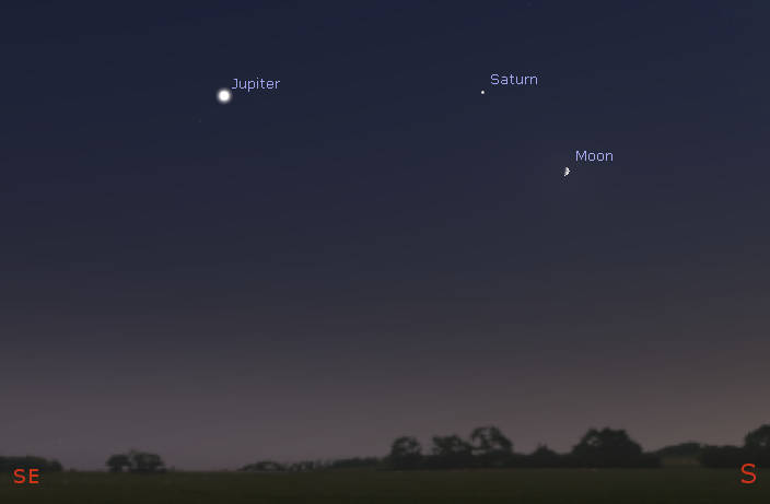 Jupiter, Saturn and the Moon at 7:45, about 45 minutes after sunset in this view to the south-southeast. Click on the image to enlarge it. Created using Stellarium.