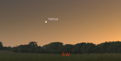 Venus seen in twilight at 7:20 pm, about 20 minutes after sunset on October 13, 2021. Created using Stellarium.