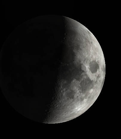 The crescent Moon as it might appear tonight in binoculars or small telescope. It appears here right side up as it would appear in the sky at 6 pm tonight, November 10, 2021. Created using Stellarium.