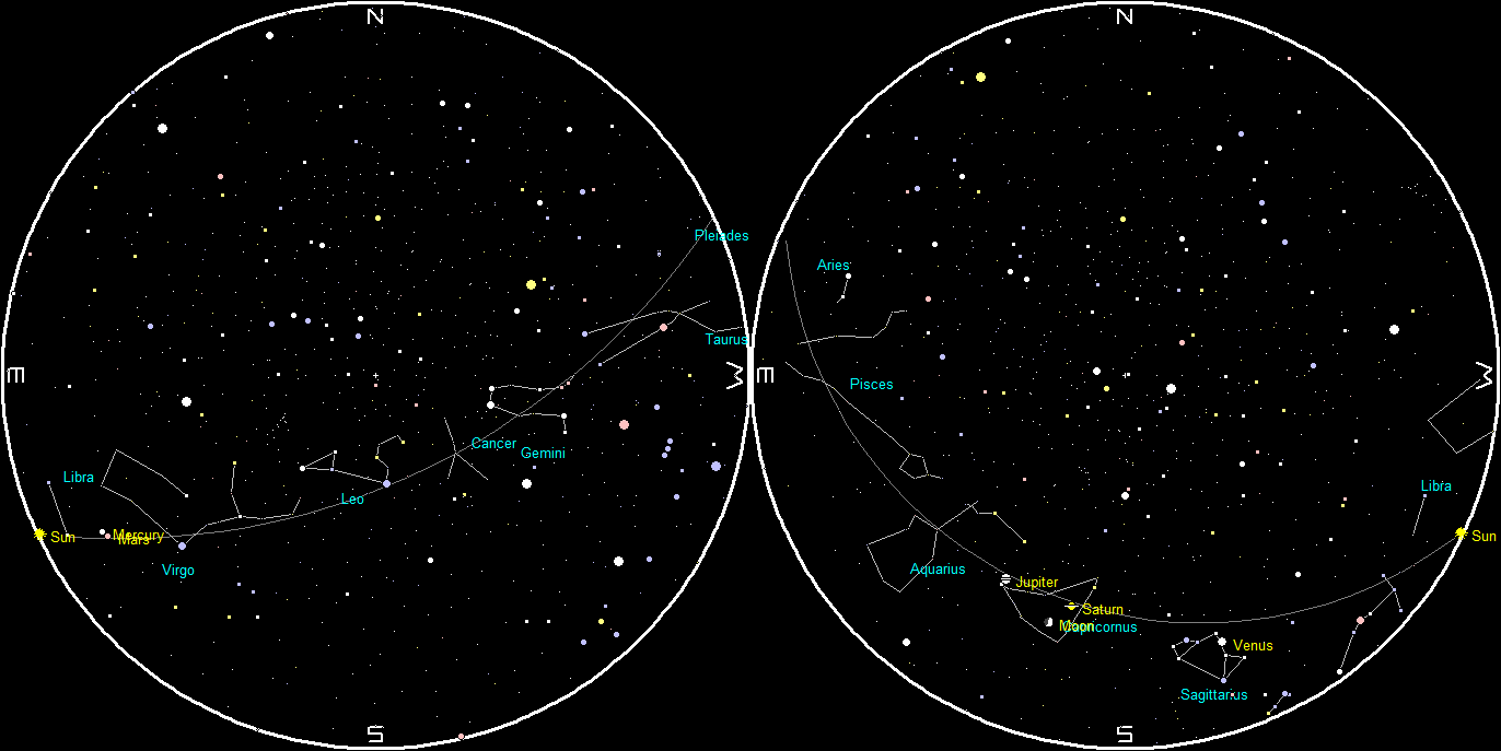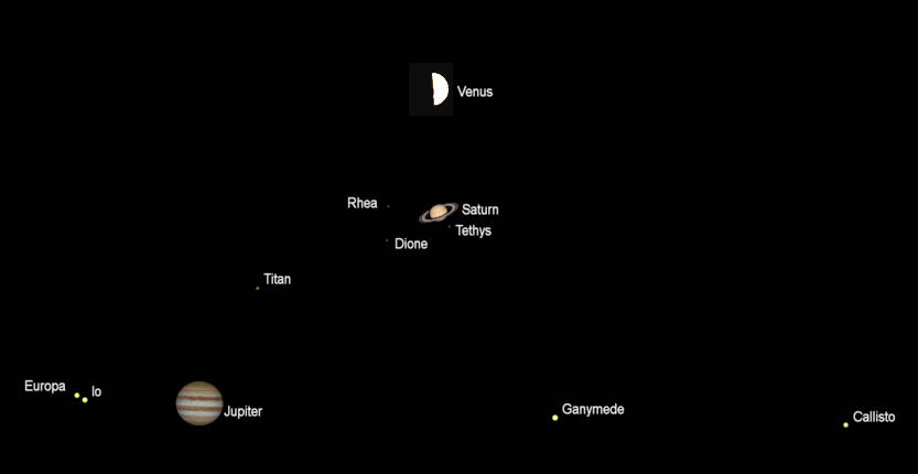 Let’s search for the naked-eye planets for this week. Venus should be visible in the southwestern evening twilight by 5:40 tonight. It’s a fat crescent in telescopes. Venus will set at 7:46 pm. By 6 pm, Both Jupiter and Saturn should be able to be spotted in the southern sky. Saturn will be dimmer, and to its right. Saturn will be above and right of the Moon tonight. It will set first at 10:45 pm, with Jupiter following at 12:07 am. Saturn’s rings are a beautiful sight in a telescope of even modest power, but the planet will appear tiny. In the morning sky, Mercury now can only be spotted in a telescope, so its appearance in the morning sky is, for all practical purposes, over.