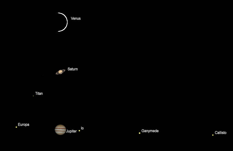 Telescopic views of the bright planets and their brighter moons (north up) as they would be seen in a small telescope, with the same magnification, this evening at 7 pm, December 29, 2021. Apparent diameters: Venus, 59.89″, 3.7% illuminated; Saturn 15.49″, its rings 36.09″; Jupiter, 35.57″. Mercury is not shown, its apparent diameter is 5.68″ and is 82.4% illuminated. Mars also is not shown, its apparent diameter is 3.99″. The ” symbol means seconds of arc (1/3600th of a degree.) Created using Cartes du Ciel (Sky Charts).
