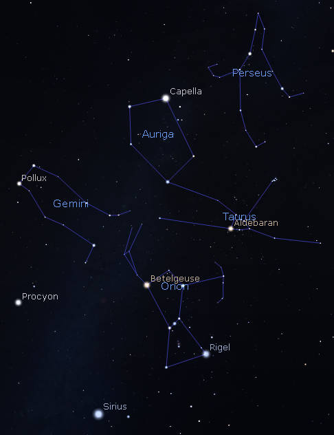 The constellation Auriga the charioteer is nearly overhead at 9 p.m. It is a pentagon of stars, with the brilliant star Capella at one of its upper corners. Capella represents a she-goat he’s carrying. A narrow triangle of stars nearby Capella represents her three kids. The chariot, or by some a wagon is not seen in the stars and is supposed to be pulled by four horses, abreast. Or four oxen, or two oxen, a horse, and a zebra. None of these are depicted in the stars. The only constellation art I’ve seen is a man holding a large goat and three baby goats. There’s no chariot, no wagon and definitely no horses, oxen or zebras. What I see is a distinctive pentagon of stars, with one, Capella, brighter than the rest, and a nearby small triangle of stars.