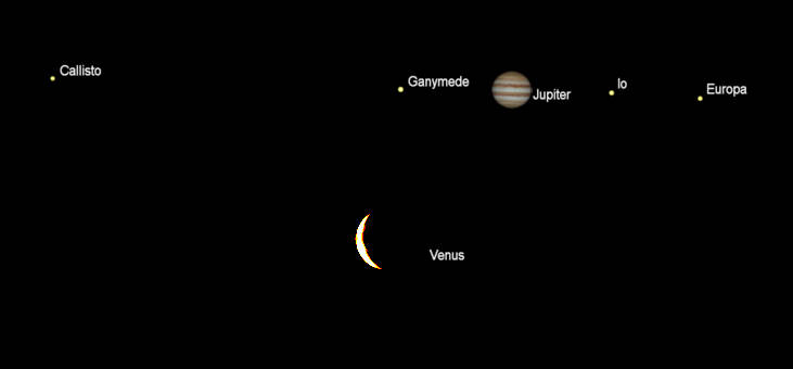 Let’s search for the naked-eye planets for this week. There is just one planet left in the evening sky now. Jupiter will be visible in the southwest by 6:15 pm. Jupiter will set at 8:12 pm. Saturn is too close to the Sun to be seen, and will cross behind the Sun in 9 days to enter the morning sky. In the morning sky, Venus, our brilliant morning star, and the much dimmer Mars will rise about the same time about 6:05 am. Both will appear low in the southeastern twilight by 7 am. Mars will be to the right of Venus by 11 and a half degrees, about the width of a fist held at arm’s length. Mars’ rival in color and brightness, the red giant star Antares, is to its right and a bit higher, and nearer the waning crescent Moon.