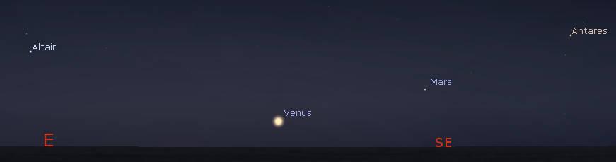 Venus and Mars as they might appear at 7:15 am, about an hour before sunrise tomorrow morning, January 20, 2022. At that time, the waning gibbous moon will appear in the west. Click on the image to enlarge it. Created using Stellarium.