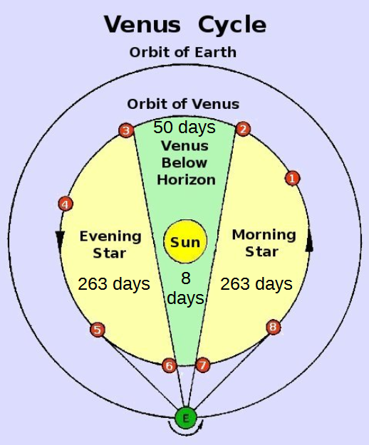 Venus Cycle derived from John P Pratt who had another purpose for the diagram and annotated to include the day number of days in each phase. For my purposes, ignore points 1 and 4. The Mayan cycle starts with 7, the first appearance of Venus during the morning. Points 8 and 5 are the points where Venus is at greatest elongation from the Sun. Credit John P Pratt.