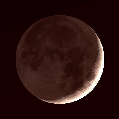 Three day old Moon with earth shine as it might look like in binoculars tonight, January 5, 2022. Created using Stellarium.