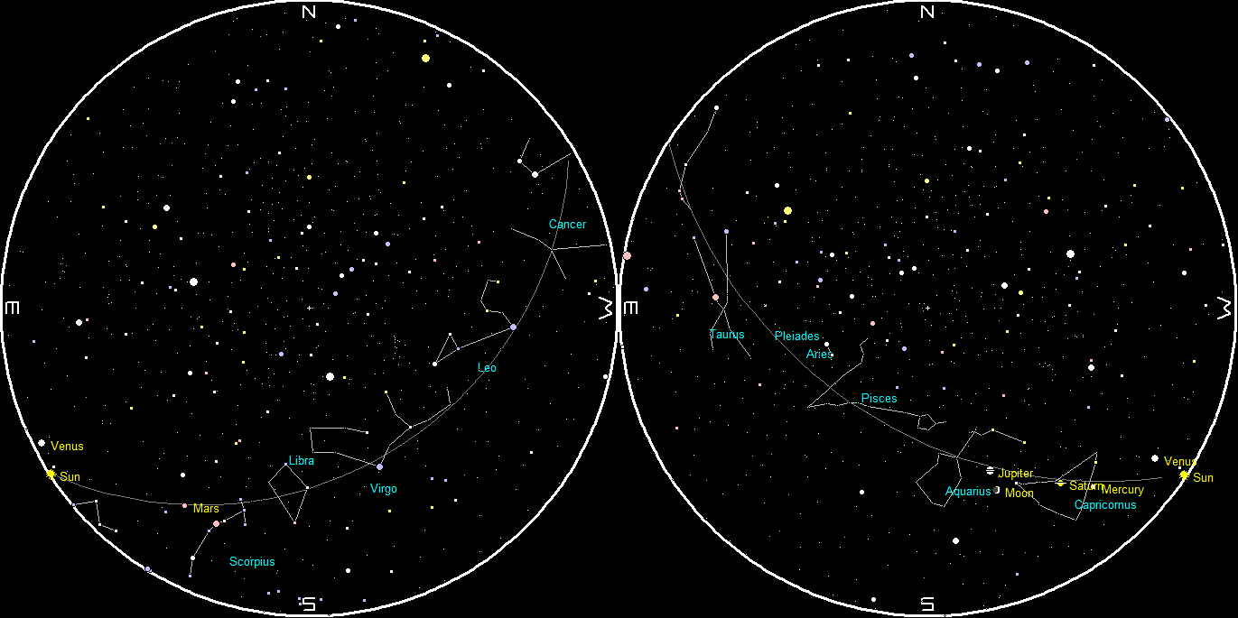 The naked-eye planets and the Moon at sunset and sunrise on a single night, starting with sunset on the right on January 5, 2022. The night ends on the left with sunrise on the 6th. Click on the image to enlarge it. Created using my LookingUp program.