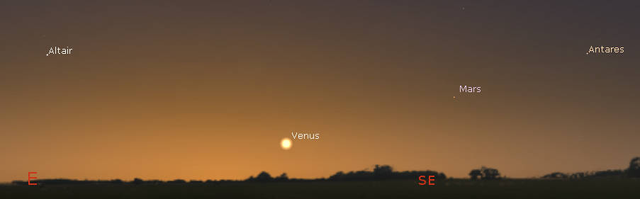 Venus, Mars and two bright stars in the morning at 7:30, around 45 minutes before sunrise. Venus will pass Mars on for the first time this year on February 12th, only to have Mars pass Venus back on March 15th. That’s 5 days before Venus reaches its greatest separation from the Sun, and begins to head back around the Sun. Click in the image to enlarge it. Created using Stellarium.