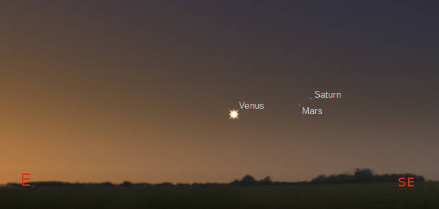 Venus, Mars and Saturn as they might be seen around 6:30 tomorrow morning, April 7, 2022. Created using Stellarium.
