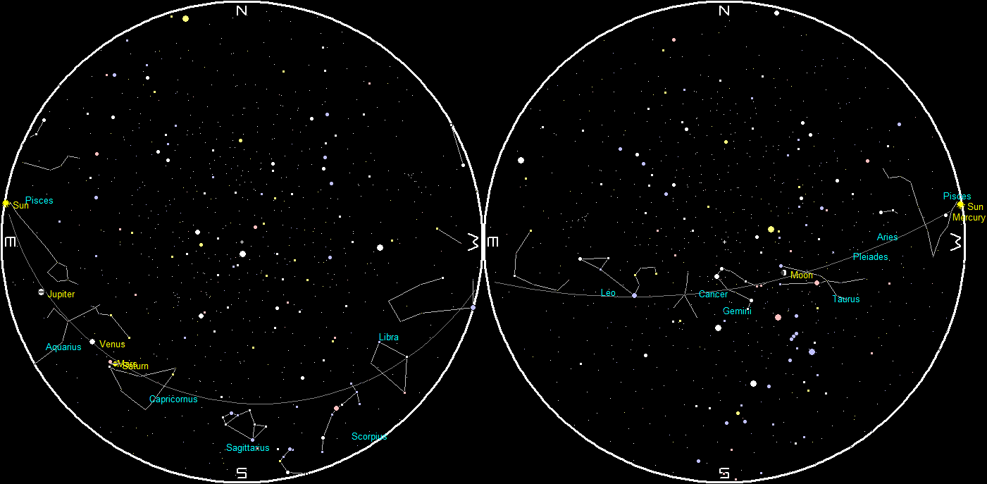 The naked-eye planets and the Moon at sunset and sunrise on a single night, starting with sunset on the right on April 6, 2022. The night ends on the left with sunrise on the 7th. Notice that all the naked-eye planets are in the morning sky now, with the Moon still hanging out in the evening sky. Click on the image to enlarge it. Created using my LookingUp program.