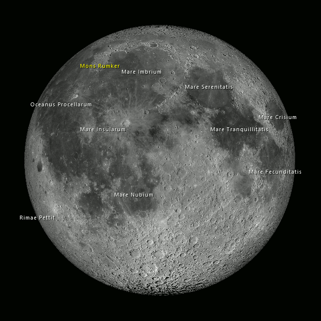 Tonight’s Moon is nearly full, only two days to go. In the evening, the little dark sea on the Moon called Mare Crisium or Sea of Crises is near the top of the Moon. Now it’s real close to the top edge of the Moon, what astronomers call the limb. Ten days ago, when the Moon was a crescent, Mare Crisium was farther from the limb. This wobbling motion over the lunar month is called libration. This occurs because the Moon has an elliptical orbit of the Earth and speeds up when it’s closer and slows when it’s farther away. However, the Moon’s rotation is constant due to its angular momentum. The period of the revolution of the Moon around the Earth exactly matches its rotation. When the Moon is farthest, its rotation gets a bit ahead of its revolution around the Earth. When closest, the rotation lags a bit. So it appears to wobble over the lunar month.